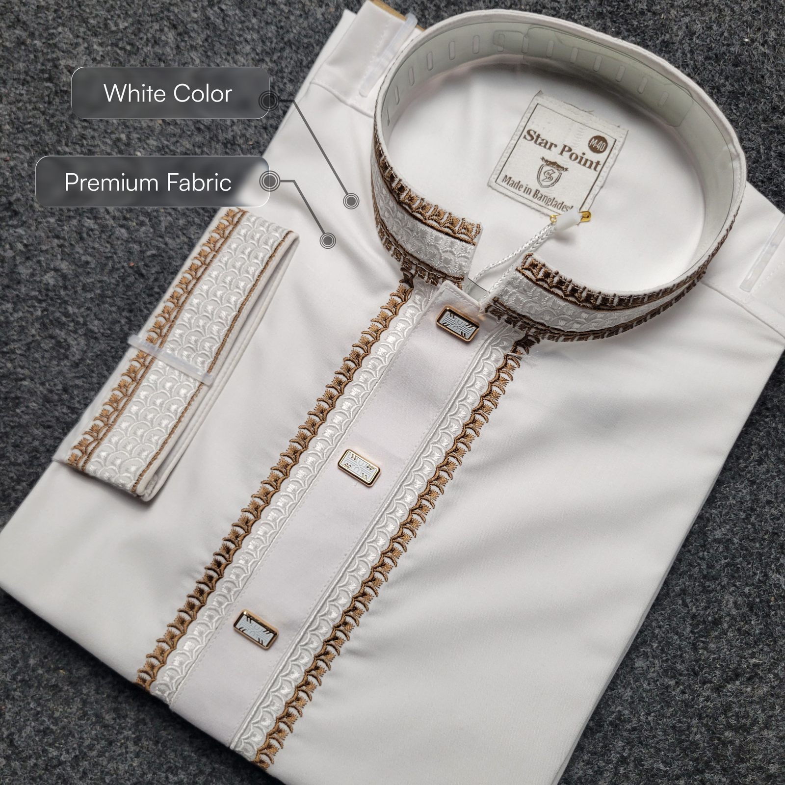 This premium white panjabi is designed for men who prefer comfort with a clean, elegant look.